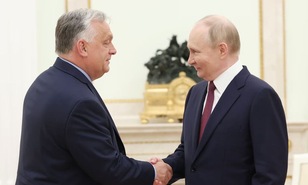| Le président russe Vladimir Poutine (droite) et le Premier ministre hongrois Viktor Orban, lors d'une rencontre au Kremlin, à Moscou, le 5 juillet 2024. |