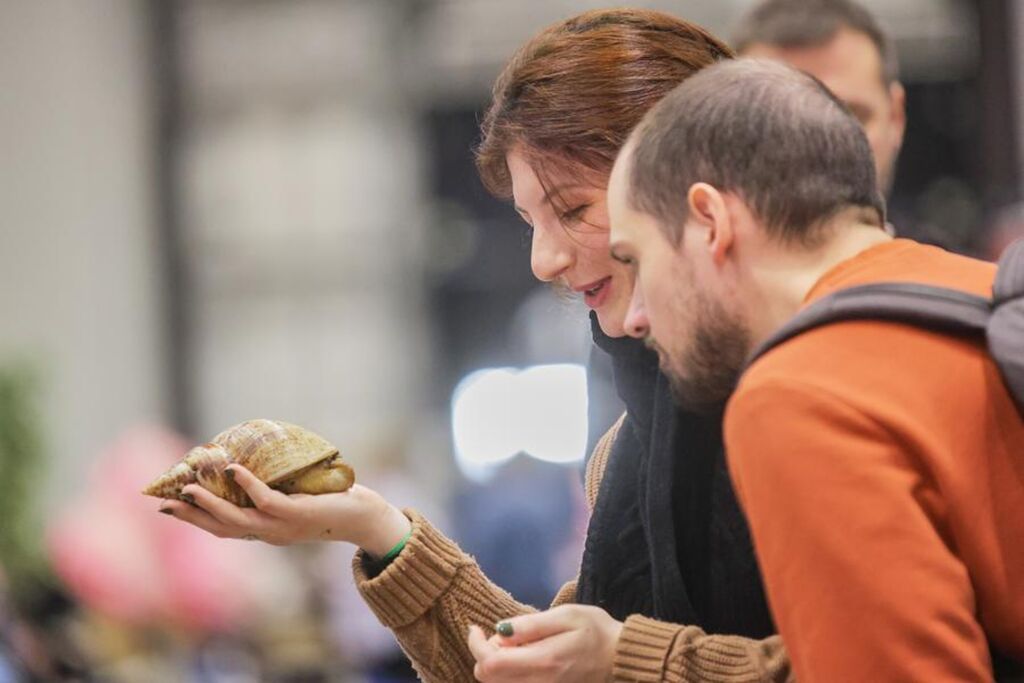 | Deux visiteurs observent un escargot géant lors du Salon des animaux de compagnie à Saint-Pétersbourg, en Russie, le 14 décembre 2025. |