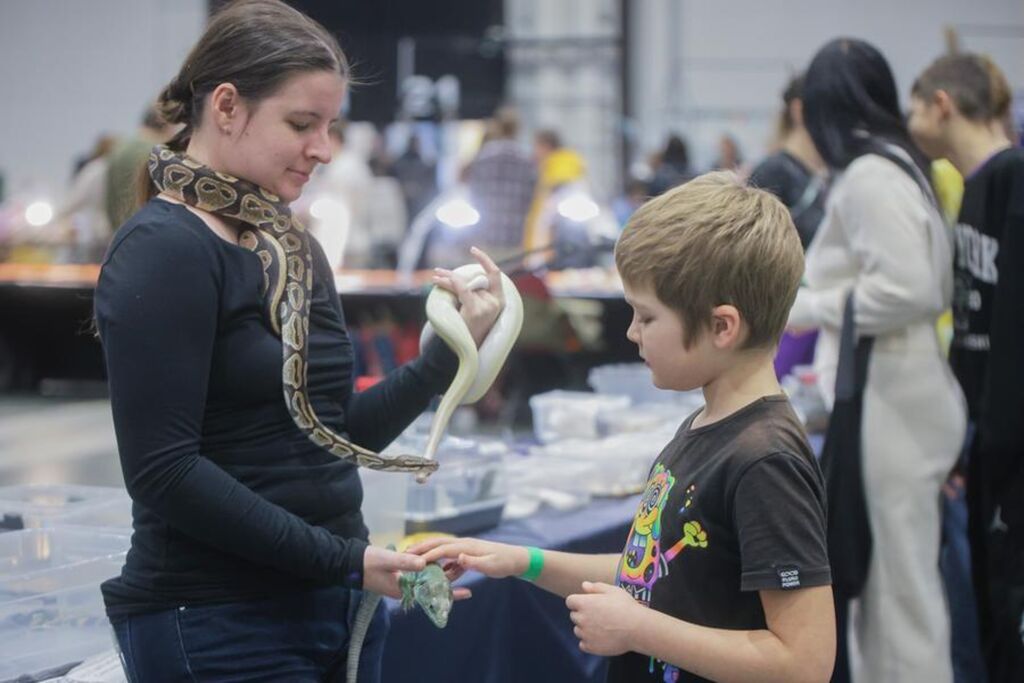 | Un garçon touche un reptile lors du Salon des animaux de compagnie à Saint-Pétersbourg, en Russie, le 14 décembre 2025. |