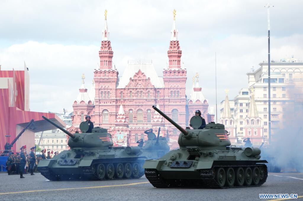 Des régiments de cérémonie de différents pays ont défilé sur la Place Rouge, suivis par des colonnes de matériel militaire, avec en tête les légendaires chars T-34.