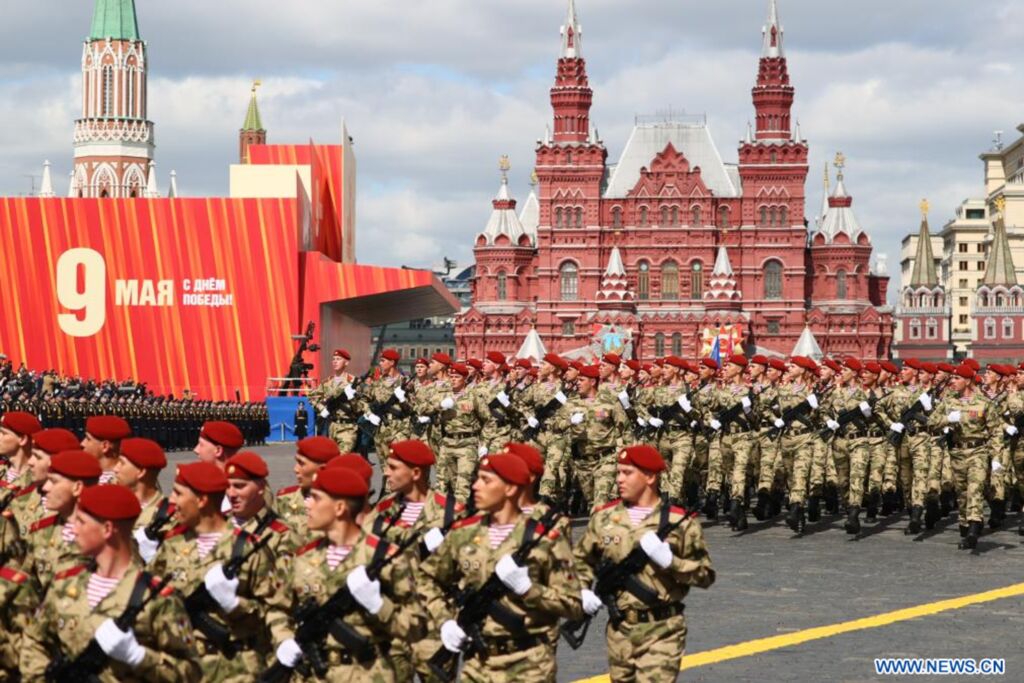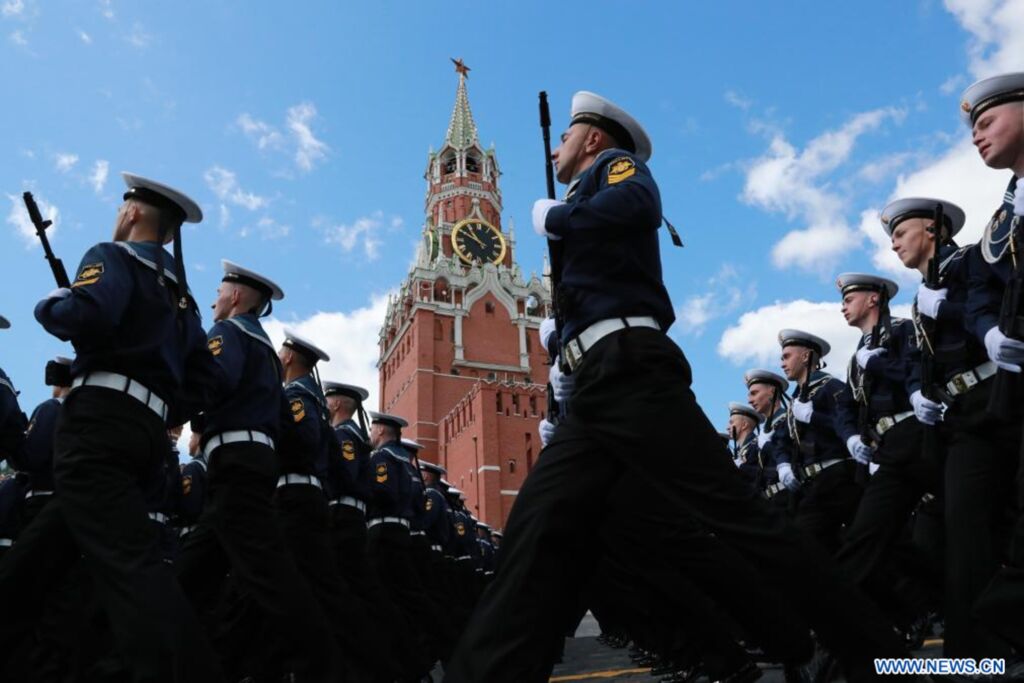 | Des soldats marchent lors du défilé marquant le 80e anniversaire de la victoire de l'Union soviétique dans la Grande Guerre patriotique à Moscou, en Russie, le 9 mai 2025. |