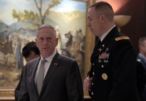 | Le ministre américain de la Défense, James Mattis (gauche), lors de la conférence Manama Dialogue à Bahreïn, le 26 octobre. |