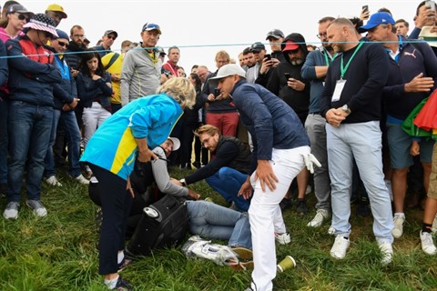 | Une spectatrice blessée par une balle de golf, jouée par l'Américain Brooks Koepka (droite), lors de la Ryder Cup à Saint-Quentin-en-Yvelines. |