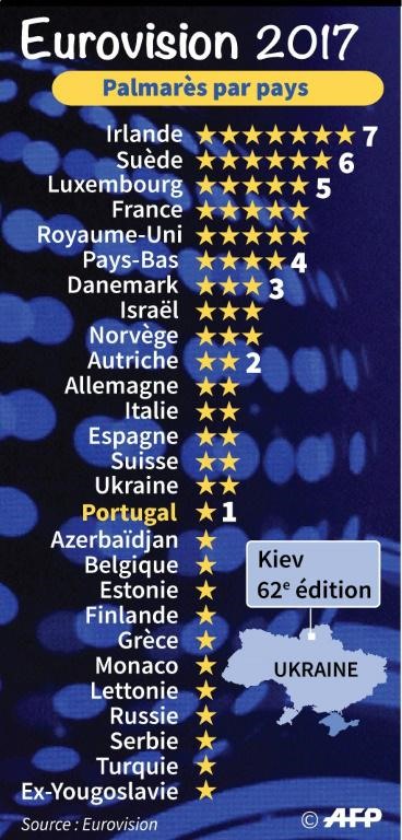 | Palmarès de l'Eurovision par pays après la victoire du Portugal lors de la 62e édition, le 13 mai à Kiev. |