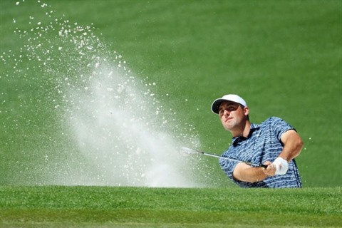 | L'Américain Scott Scheffler tente une approche depuis un bunker au 2e trou, lors du dernier tour du Masters, le 10 avril sur le parcours d'Augusta (Géorgie). |
