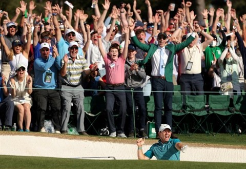 | La joie du Nord-Irlandais Rory McIlroy, après avoir rentré un birdie depuis le bunker au 18e trou, lors du dernier tour du Masters, le 10 avril sur le parcours d'Augusta (Géorgie). |
