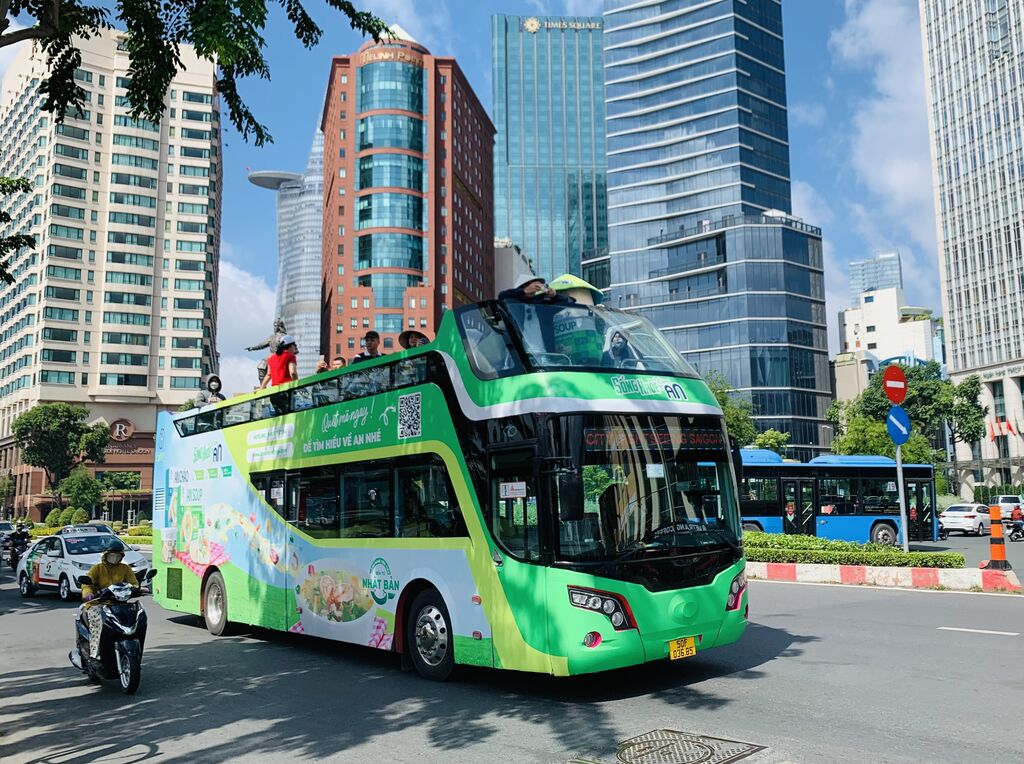 | Des touristes découvrent Hô Chi Minh-Ville en autobus. |