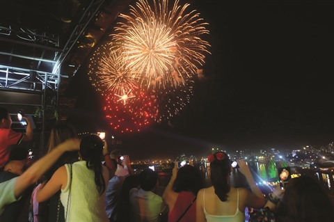 | Réveillon du Nouvel An au Majestic Saigon avec des fêtards qui profitent des feux d'artifice. |