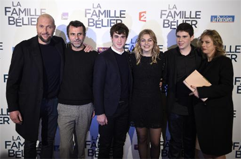 | L'équipe de + La famille Bélier +, de gauche à droite François Damiens, le réalisateur Eric Lartigau, les acteurs Ilian Bergala, Louane Emera, Luca Gelberg et Karin Viard à Paris le 9 décembre 2014. |