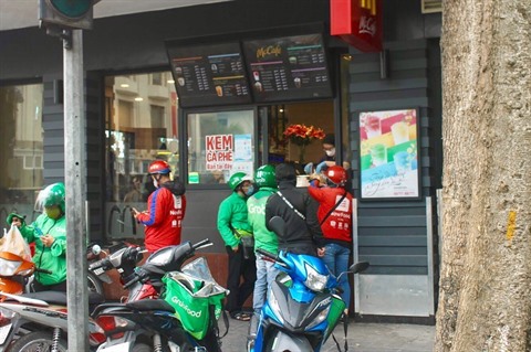 | Les Hanoïens achètent davantage leurs repas via les applications Grab ou Now car ils ne peuvent plus se rendre dans les restaurants. |