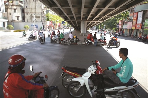 | Les livreurs attendent leurs commandes sous un viaduc à Hanoï. |