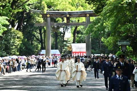 Une trentaine de prêtres shinto vêtus de blanc et coiffés de hauts couvre-chefs noirs ont marché sous le haut tori, ou porte du sanctuaire, vers le bâtiment principal pour "annoncer" aux divinités l'accession au trône du nouvel empereur.