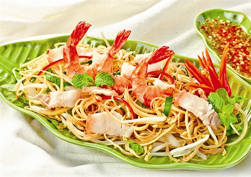 6. Égoutter les fleurs de bananier. Ajouter la viande, les herbes et la carambole. Assaisonner avec du nuoc mam préparé (environ 5 cuillères à soupe, mais il faut toujours goûter). Ajouter les crevettes et quelques cuillères à soupe de cacahuètes pilées. Mélanger. Dresser sur le plat de service. Garnir de feuilles de coriandre et de piment.
