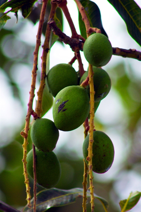 À tout seigneur, tout honneur ! Je vous présente Madame Mangue. La plus connue, avec sa peau allant de diverses nuances de vert au rouge en passant par le jaune. C’est pour moi le symbole de la fidélité totale, tellement il est difficile de retirer le noyau de la chair. Ces deux-là, pour les séparer, il faut mordre dedans à pleines dents, sans se soucier d’avoir du jus qui dégouline le long du menton et le cou, sur les mains... Quand vous allez à la campagne, en saison, votre hôte vous offre souvent un fruit qu’il cueille à l’arbre de son jardin. Je me souviens de la première mangue qui me fut ainsi offerte au Vietnam. C’était à l’occasion de la fête anniversaire de la mort de l’arrière-grand-père de mon ami Tuân. Il m’avait invité à sa maison natale, et j’y avais rencontré toute sa famille, y compris son grand-père, en compagnie d’autres vétérans des périodes troublées du siècle dernier… L’un d’eux m’avait courtoisement convié à venir visiter sa maison et son jardin. Ce que j’avais accepté avec enthousiasme, tout à ma fièvre anthropologique de néophyte. Arrivé chez lui, une adorable maison aux murs bleus et aux volets verts, enchâssée dans un véritable paradis d’arbres fruitiers tropicaux, il m’avait fait asseoir dans un fauteuil, et l’interrogatoire a commencé. Que pensé-je du Vietnam ? Est-ce que je connaissais Hô Chi Minh ? Mes réponses devaient le satisfaire, car il remplissait régulièrement de mangues, une petite corbeille en osier, qu’il poussait vers moi. C’était de toutes petites mangues, sucrées comme des burlats et fibreuses comme du gingembre frais. Ne voulant pas vexer mon hôte, je dévorais consciencieusement fruit après fruit, la modeste corne d’abondance… C’est au moment de notre séparation que les vertus laxatives de la mangue se sont déclarées ! À peine le signal d’alerte intestinal, avait-il retenti que je me précipitai dans les commodités de la maison de mon ami, heureusement à quelques mètres de là ! Ce jour-là, nous avons battu le record de lenteur pour rentrer à Hanoi, et j’ai découvert les bienfaits salvateurs de plantes à feuilles larges et épaisses, et des bosquets de bambous ou des champs de maïs ! Il m’aura fallu une semaine de cure de pamplemousse pour sortir indemne de l’aventure !