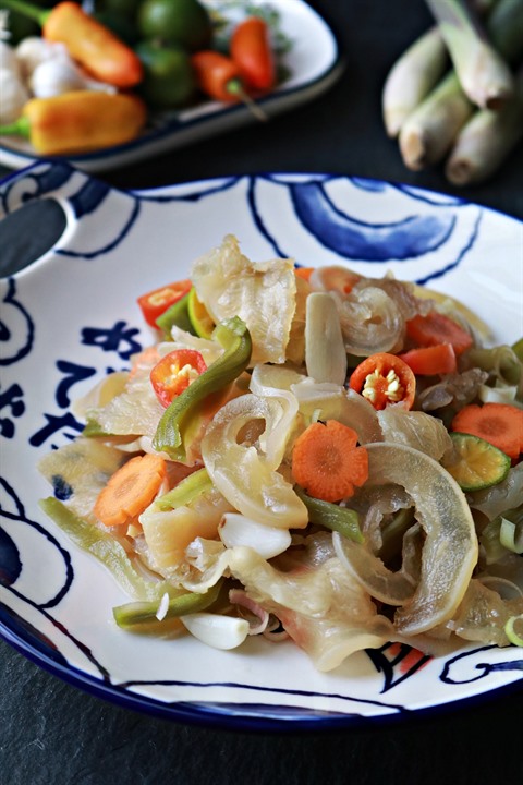 - Dans une grande casserole, recouvrir le tendon d’eau et faire bouillir avec du gingembre. Couvrir la casserole jusqu’à ébullition, enlever l’écume, réduire le feu et cuire encore pendant une heure jusqu’à ce que le tendon devienne translucide. Aussitôt, le faire tremper dans un bol d’eau froide.- Faire bouillir 250 ml d’eau avec le vinaigre et le sucre dans une autre casserole jusqu’à ce que l’eau dissolve le sucre. Remuer doucement. Éteindre le feu.