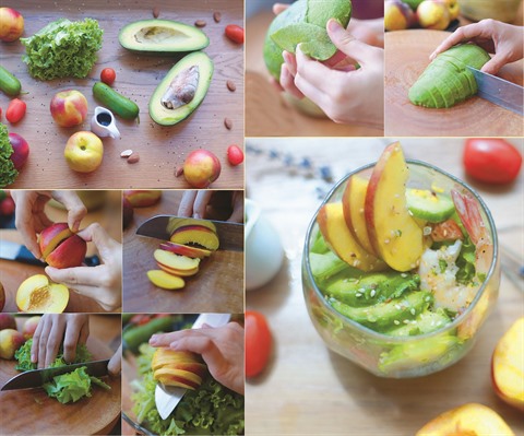- Enlever les noyaux des pêches et de l’avocat. Couper ces fruits et le concombre en tranches d’une épaisseur de 3 mm.