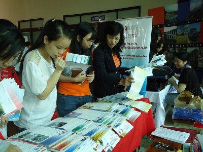 À la fin de la matinée se sont déroulés les échanges avec les anciens étudiants vietnamiens de France, qui ont pu permettre aux futurs étudiants de mieux comprendre la vie en France et de préparer au mieux leur départ. Grâce à leurs expériences et leur vécu, ces véritables témoins ont apporté des réponses pertinentes aux différentes questions des visiteurs. Ils leur ont également montré les opportunités ainsi que les perspectives professionnelles des parcours francophones.