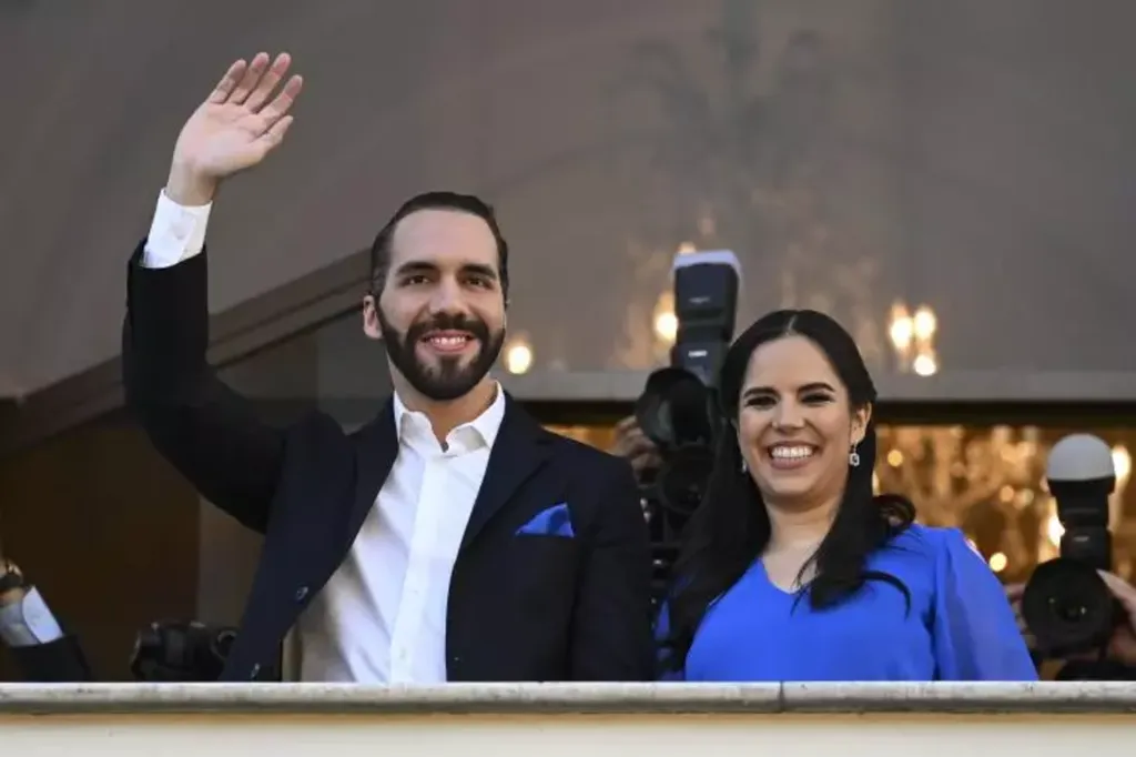 | Le président salvadorien Nayib Bukele salue ses partisans en compagnie de son épouse Gabriela Rodríguez, au Théâtre national dans le centre historique de San Salvador, le 29 février 2024. |