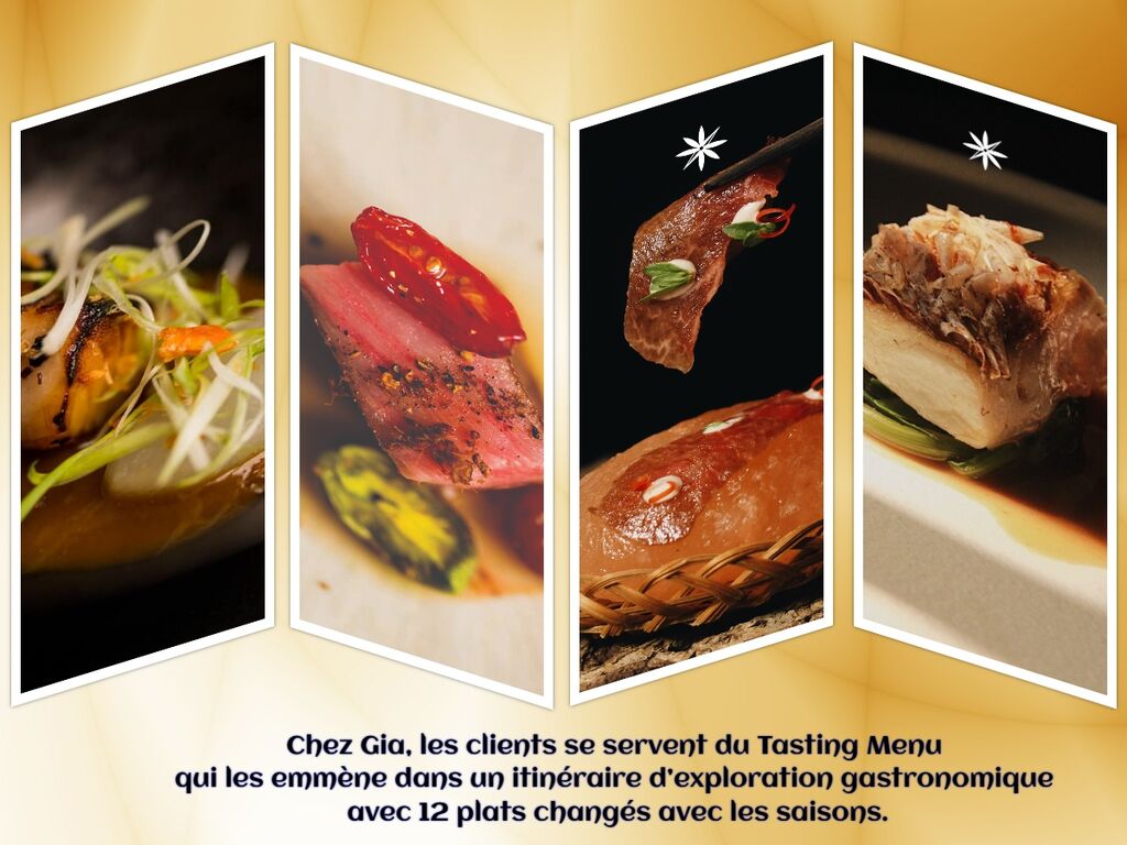 Chez Gia, les clients se servent du “Menu de Dégustation” (Tasting Menu), tout à fait différent du menu à la carte, avec 12 plats proposés, accompagnés de boissons adaptées. Gia change son menu tous les trois mois et les mets reviennent rarement.