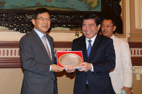 | Nguyên Thanh Phong, président du Comité populaire de Hô Chi Minh-Ville (droite), et le directeur général de la société Samsung Vietnam, Shim Won Hwan. |