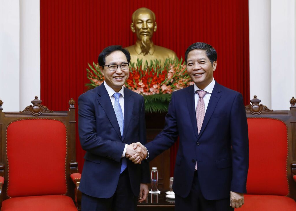 | Le chef de la Commission de l’économie du Comité central du PCV, Trân Tuân Anh (droite), et le directeur général de Samsung Vietnam, Choi Joo-ho, le 24 février à Hanoï. |