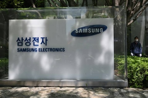 | Le logo de Samsung Electronics devant le siège de Samsung de Seocho, à Séoul, le 6 mai. |
