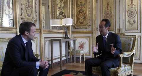 | Emmanuel Macron (gauche) et le directeur général de Samsung Electronics, Young Sohn, le 28 mars à l'Élysee. |