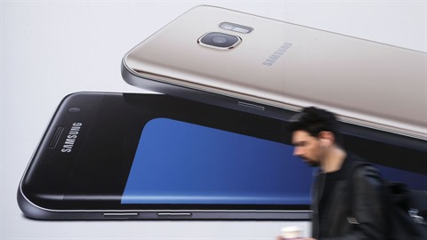 | Un homme utilise un smartphone alors qu'il passe devant une publicité pour le Samsung Galaxy S7, le 11 octobre |
