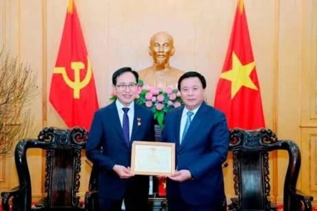 En reconnaissance de ses efforts, Nguyên Xuân Thang a remis à Choi Joo Ho l’Insigne du HCMA pour la cause de l’éducation et de la formation en théorie politique.