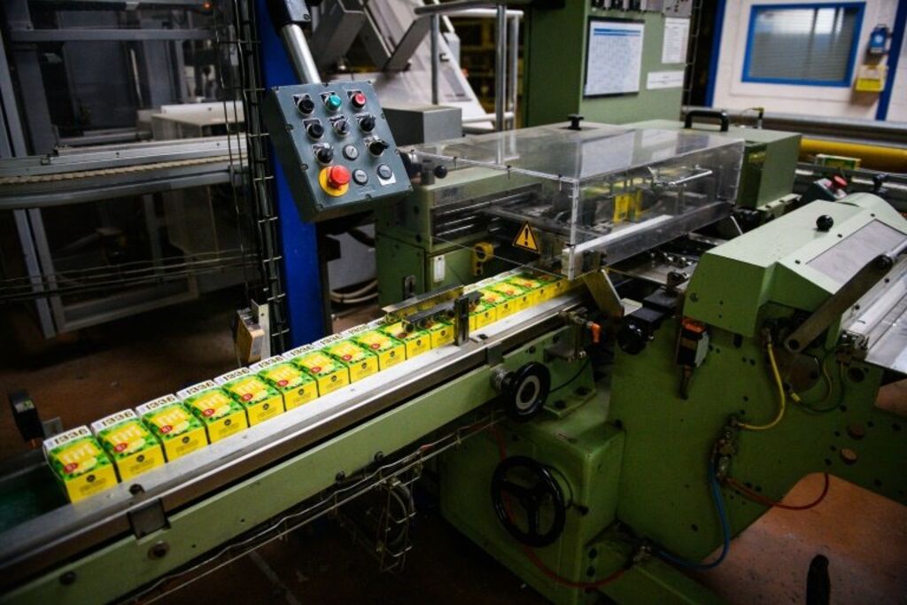 | Une boite de thé avec le logo "1336" sort d'une chaîne de production de l'usine "Scop Ti", à Gémenos, le 4 janvier 2023. |