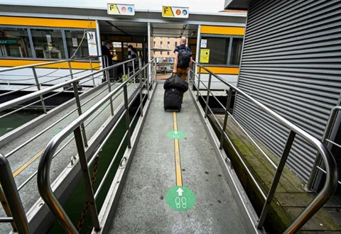 | Les marquages de distanciation instaurées pour accéder à un vaporetto, à Venise, le 13 mai. |