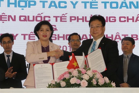 | Dre Nguyên Thi Ngoc Hô, directrice de l'hôpital Phuong Châu (gauche) et Dr Mamoru Yamashita, PDG du groupe japonais spécialisé dans la santé Kishokai, à la signature de l'accord de coopération, le 7 juillet dans la ville de Cân Tho (delta du Mékong). |