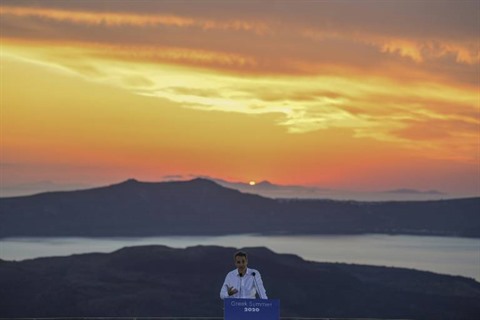 | Le Premier ministre grec Kyriakos Mitsotakis donne une conférence de presse sur l'île de Santorin le 13 juin. |