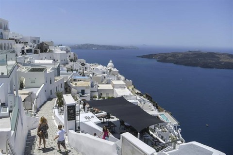 | À Fira, capitale de l'île de Santorin, en Grèce, le 14 juin. |