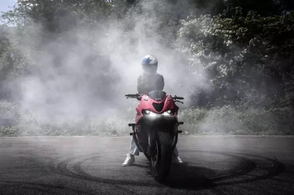 Debout, les deux pieds sur sa monture de 200 kg lancée à allure modérée, ou assise sur le guidon de celle-ci, la motarde "se défoule", le casque vissé sur la tête et son "porte-bonheur", un bracelet de perles en plastique, accroché à la poignée gauche de sa moto.