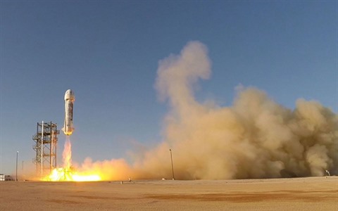 | Une fusée réutilisable de la société Blue Origin décolle le 24 novembre 2015 d'une base au Texas (Sud des États-Unis). |