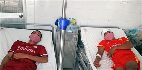 | Deux pêcheurs du bateau +JAGAL RAY+ dans un centre médical à Soc Trang (Sud). |