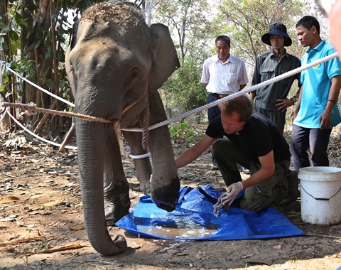 | Soins donnés à un éléphant sauvage blessé dans le Centre de protection des éléphants de Dak Lak. |