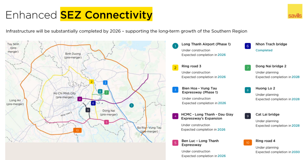 Parmi ces projets, l’aéroport de Long Thành devrait avoir l’impact le plus important. Sa phase 1, dont l’achèvement est prévu en 2026, offrira une capacité de 25 millions de passagers et de 1,2 million de tonnes de fret par an, tout en établissant une nouvelle porte d’entrée internationale pour la région.
