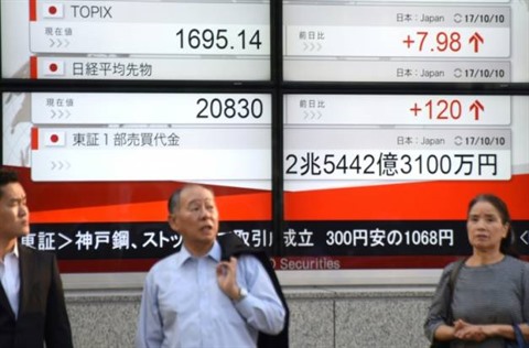 | Un panneeau d'affichage de la Bourse de Tokyo montrant une hausse de l'indice Topix le 10 octobre, malgré le plongeon de l'action du sidérurgiste Kobe Steel. |