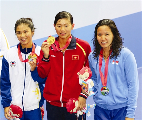 | La nageuse Anh Viên (centre) a déjà établi cinq nouveaux records des SEA Games. |