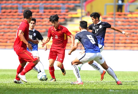 | Công Phuong (maillot rouge N°10) a réalisé le "coup du chapeau" durant le match contre le Cambodge du Tournoi de football des SEA Games 29 en Malaisie, le 17 août. |