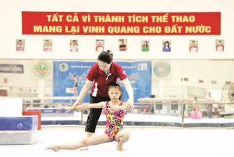 | Nguyên Thi Thanh Thuy, entraîneuse de l'équipe féminine de gymnastique, et sa jeune athlète. |