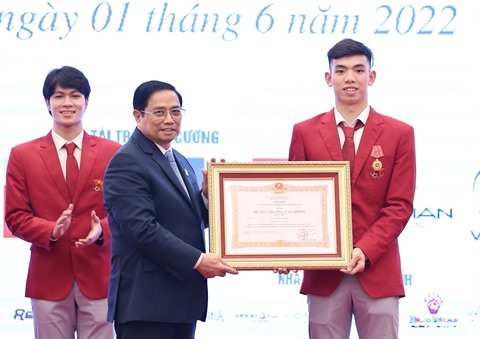 | Le Premier ministre Pham Minh Chinh (centre) remet l’Ordre du Travail de deuxième classe à un sportif. |