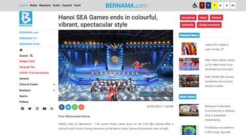 Dans l'article Les SEA Games Hanoï se termine dans un style coloré, vibrant et spectaculaire, Vikneswaran Raman, de l'Agence de presse malaisienne Bernama, a passé en revue les faits saillants de la cérémonie de clôture des 31es Jeux d'Asie du Sud-Est (SEA Games 31) tenue à Hanoï. Le journaliste malaisien a déclaré que la cérémonie, avec de superbes spectacles de lumière, a marqué le rajeunissement du sport dans la région.