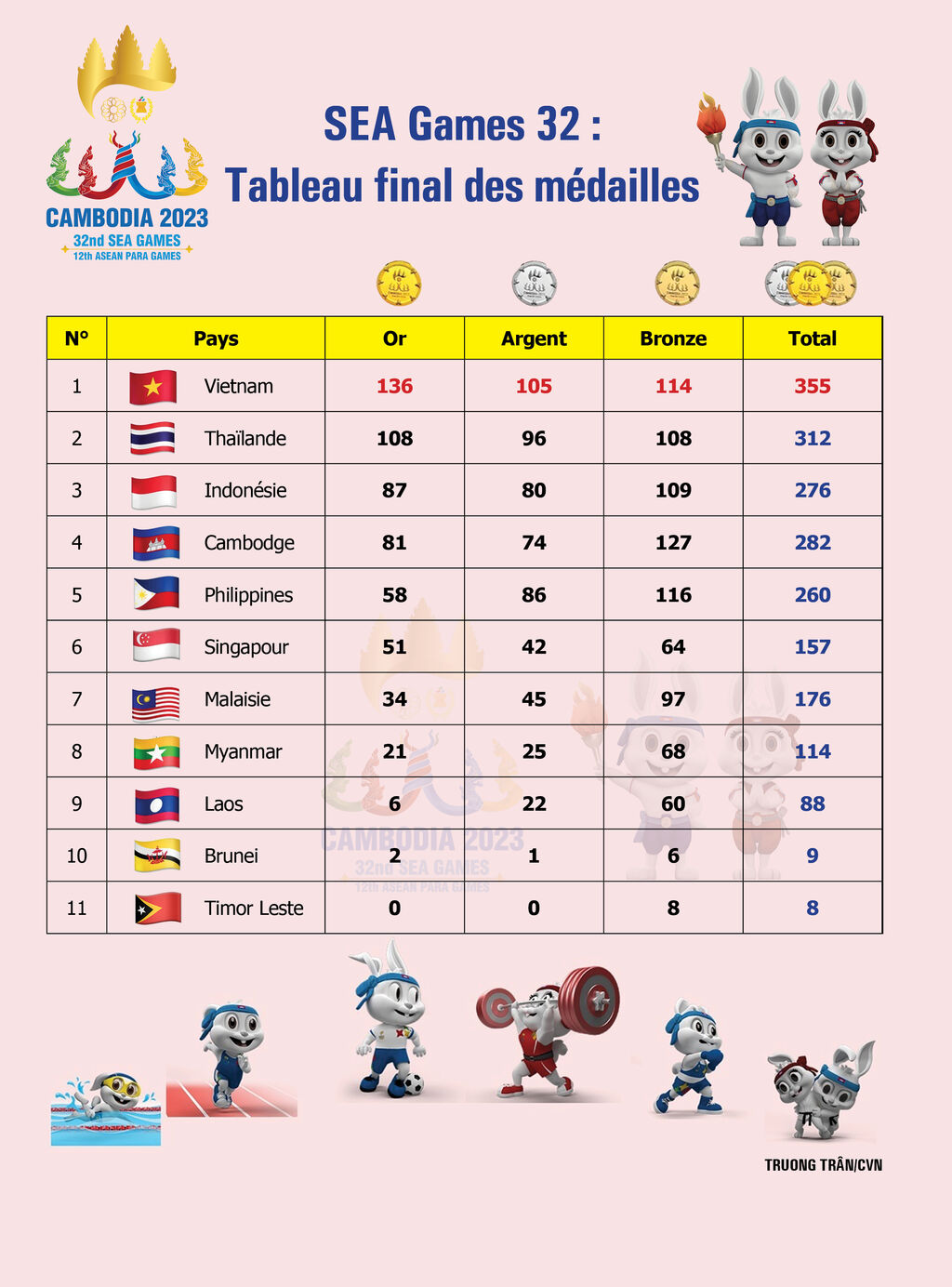 Il convient de rappeler que le Vietnam avait déjà occupé la première place du classement par nations lors des SEA Games 22 en 2003 et des SEA Games 31 en 2022, tous deux organisés dans le pays. C’est également la première fois que le Vietnam termine en tête du classement final par nations lors de deux éditions consécutives des SEA Games.