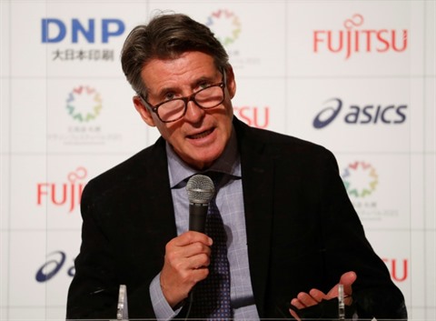 | Le président de la Fédération internationale d'athlétisme, Sebastian Coe, en conférence de presse à Sapporo, au Japon, le 5 mai. |