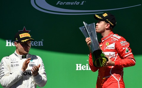 | Sebastian Vettel (droite), 2e du GP du Brésil avec la Scuderia Ferrari derrière la Mercedes de Valtteri Bottas à Interlagos, le 12 novembre 2017. |