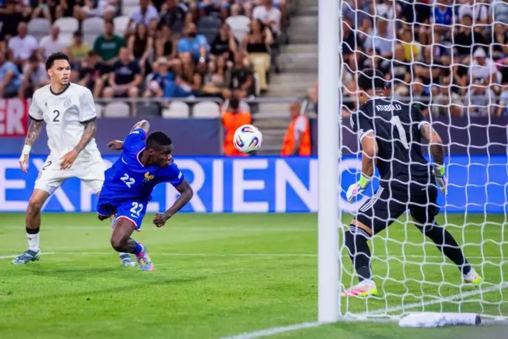 Dès la 8e minute, à la suite d'une mauvaise relance de Soungoutou Magassa, titularisé à la place du capitaine habituel, Chrislain Matsima, Paul Nebel s'est appuyé en une-deux sur le géant Nick Woltemade sur un une-deux et frappé de près, mais Guillaume Restes est parvenu à dévier sur sa barre. Le portier français n'a rien pu faire quand Nelson Weiper, à l'affût, a repris de volée la balle qu'il a glissée dans le but vide (1-0).