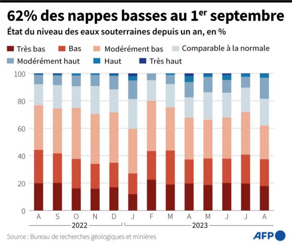 Au 1er septembre, la France comptait toujours 62% de ses nappes phréatiques, principales réserves d'eau potable, en dessous des normales de saison, dont 18% à des niveaux très bas, a annoncé jeudi 14 septembre le Bureau de recherches géologiques et minières (BRGM).